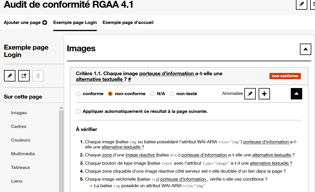 You can now audit a site, looking at the 106 criteria of the RGAA.