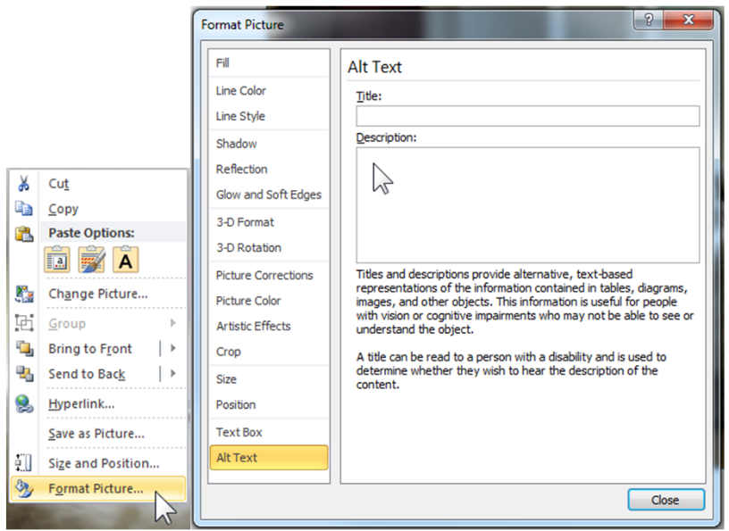 Note: If a picture or a chart is too complex to describe with alt text, you will need to provide a text description elsewhere. You can add the full description to the Notes section of the slide for example. In this case, put a very short description in the alt text, endings with the words: “full text description in the Notes section of this slide”.