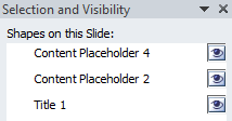 On the Home tab, in the Drawing group, select Arrange > Selection Pane.