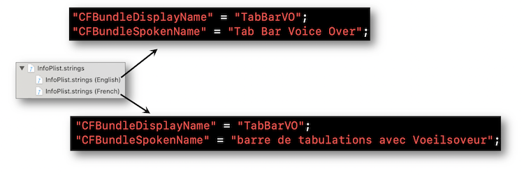 CFBundleSpokenName is the property list key that vocally replaces an application name and might take many different translations depending on the foreign languages.