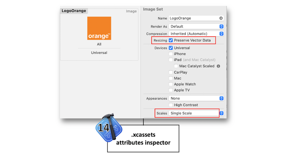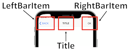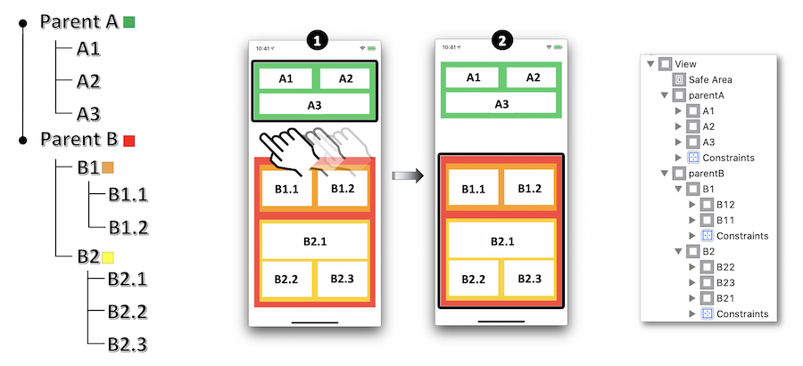 The Xcode InterfaceBuilder shows the structure used for the example hereunder: