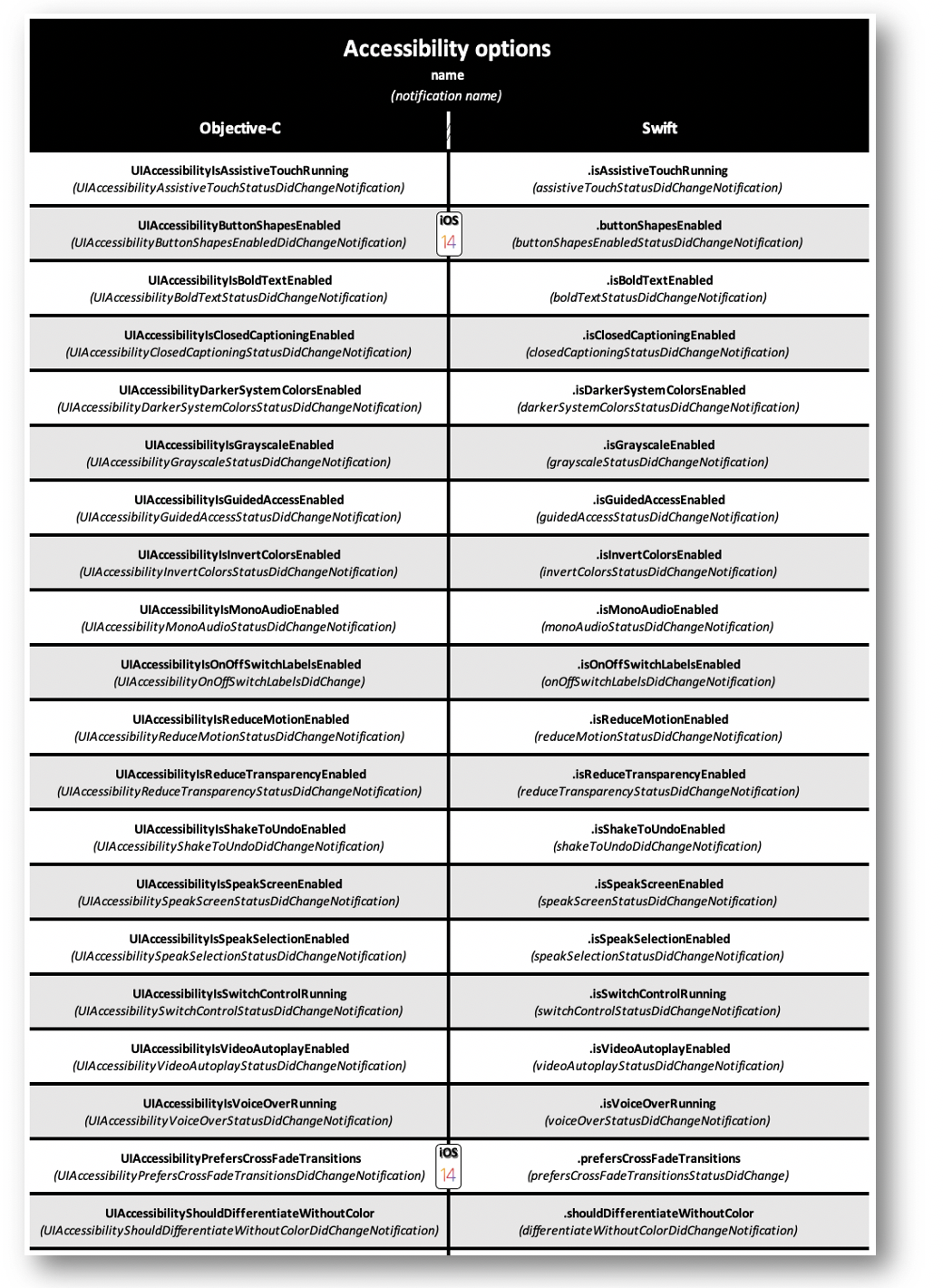 This guide aims to present the various iOS SDK accessibility options : through different categories, it explains how to use the accessibility attributes / methods and provides links to the Apple official documentation.