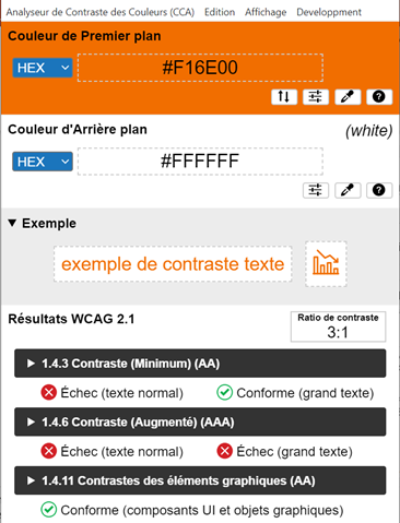 Le logiciel Colour Contrast Analyser indique si les contrastes de couleurs utilisés sont conformes.