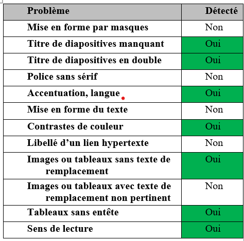 Erreurs détectées automatiquement par le correcteur d’orthographe (Fichier > Options > Vérification) et le vérificateur d’accessibilité: